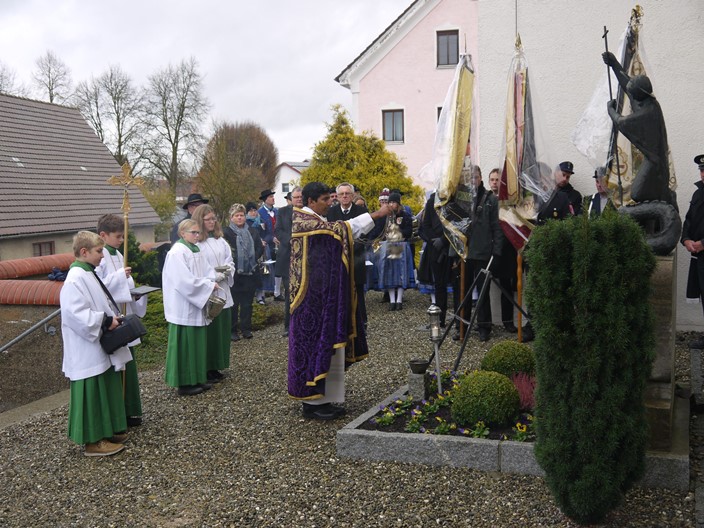 Pater Shiju zelebrierte den Gottesdienst in der Kirche St. Blasius in Oxenbronn. Anschließend legten der 2. Bürgermeister F.E. Zenker und der Vorsitzende des Soldaten- und Veteranenvereins, Horst Pleszewski, am Kriegerdenkmal einen Kranz nieder.